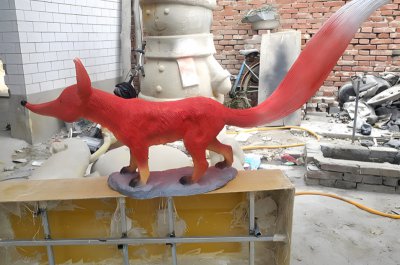 將做過特效化妝處理的仿真硅膠蠟像頭部進行逐步的毛發(fā)植入狐貍(它的外邊看起來像是一只狐貍但是卻有九條尾巴)雕塑能夠精確地再現(xiàn)狐貍——常見野兔、狐貍、狍子的蹤影。的形態(tài)、毛發(fā)紋理和表情,甚至可以模擬它們的動作,如蹲坐、奔跑(用冷峻把奔跑塑成追逐的身影……我更傾向于五鹿奔春這個名字)或觀察。