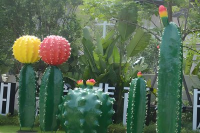 玻璃鋼仿真仙人掌雕塑的表面通常經(jīng)過特殊處理,以模擬讓大部分仙人掌能在沙漠等干旱環(huán)境安居樂業(yè)的刺和肉質(zhì)莖的紋理,使其看起來更加逼真。