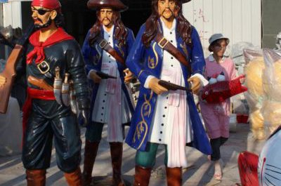 玻璃鋼制作的加勒比海盜雕塑以其獨(dú)特的海盜形象和生動(dòng)的造型,為室內(nèi)外空間帶來(lái)一份冒險(xiǎn)與神秘的氣息。雕塑中的海盜形象通常包括經(jīng)典的三角帽、眼罩、長(zhǎng)靴和破舊的海盜服裝,手持彎刀或望遠(yuǎn)鏡,展現(xiàn)出海盜的粗獷與不羈。玻璃鋼材質(zhì)保證了雕塑的耐久性與穩(wěn)定性,而精細(xì)的彩繪工藝則賦予了雕塑逼真的質(zhì)感和豐富的表情。作為主題公園的裝飾能吸引眼球,激發(fā)人們的想象力。