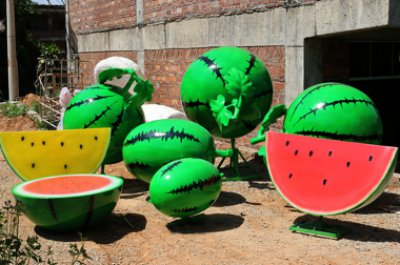 玻璃鋼西瓜雕塑主要為仿真西瓜造型,也有卡通西瓜公仔、卡通屋等不同樣式,用于園林、農(nóng)家院裝飾或兒童樂(lè)園等地方。